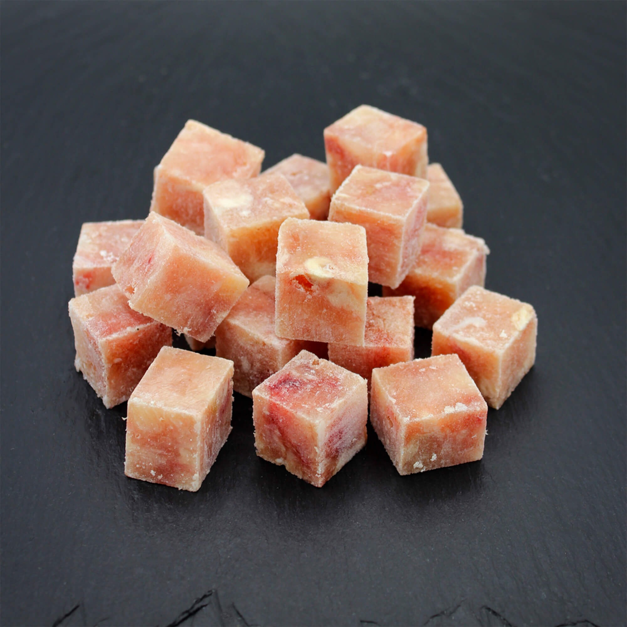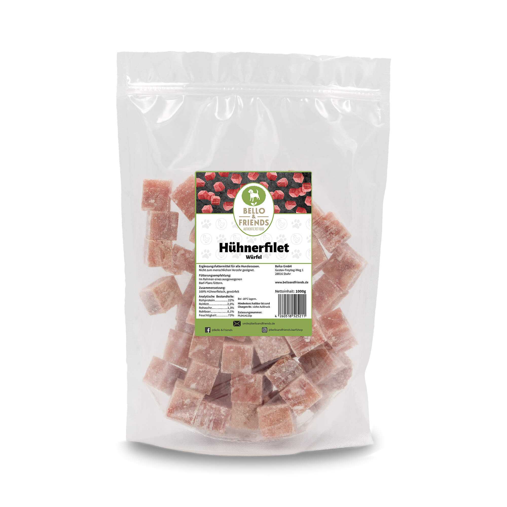 Verleihe dem Barf-Menü deines besten Freundes eine Extraportion Geschmack und Gesundheit mit unseren 100% Hühnerfilet-Würfeln. Diese hochwertige Proteinquelle, sorgfältig zubereitet aus reinem Hühnerfilet, ist die ideale Ergänzung für eine ausgewogene und nährstoffreiche Ernährung. Perfekt geeignet für ein individuelles Menü, liefern diese Würfel essentielle Aminosäuren und Vitamine, die das Wohlbefinden deines Hundes unterstützen.