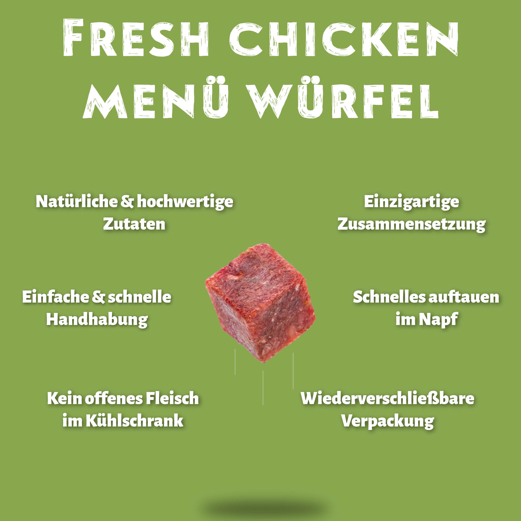 Ganz ohne künstliche Zusätze oder Konservierungsstoffe bleibt das Fresh Chicken Complete Menü Würfel ein echtes Naturprodukt – genau das, was dein Hund verdient!