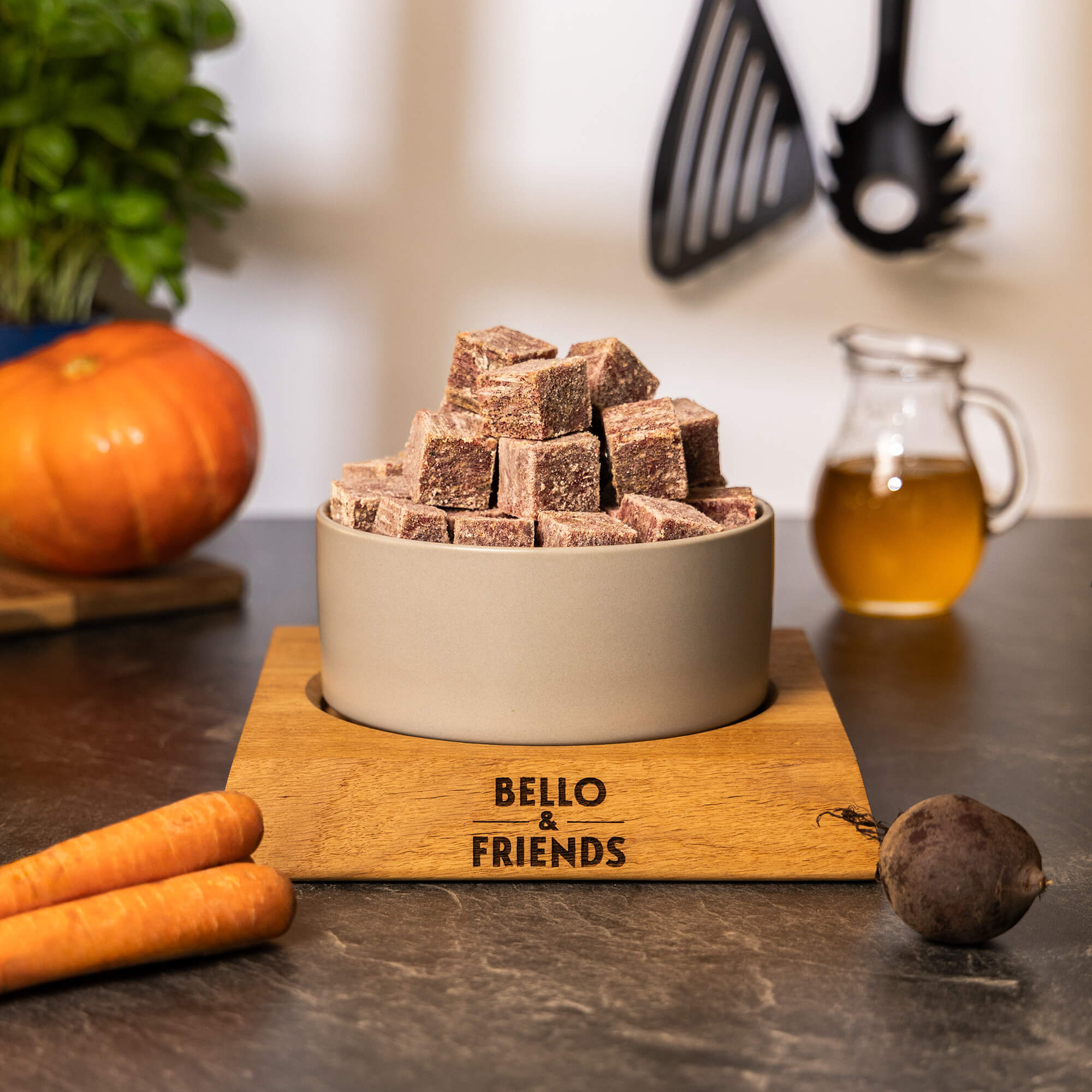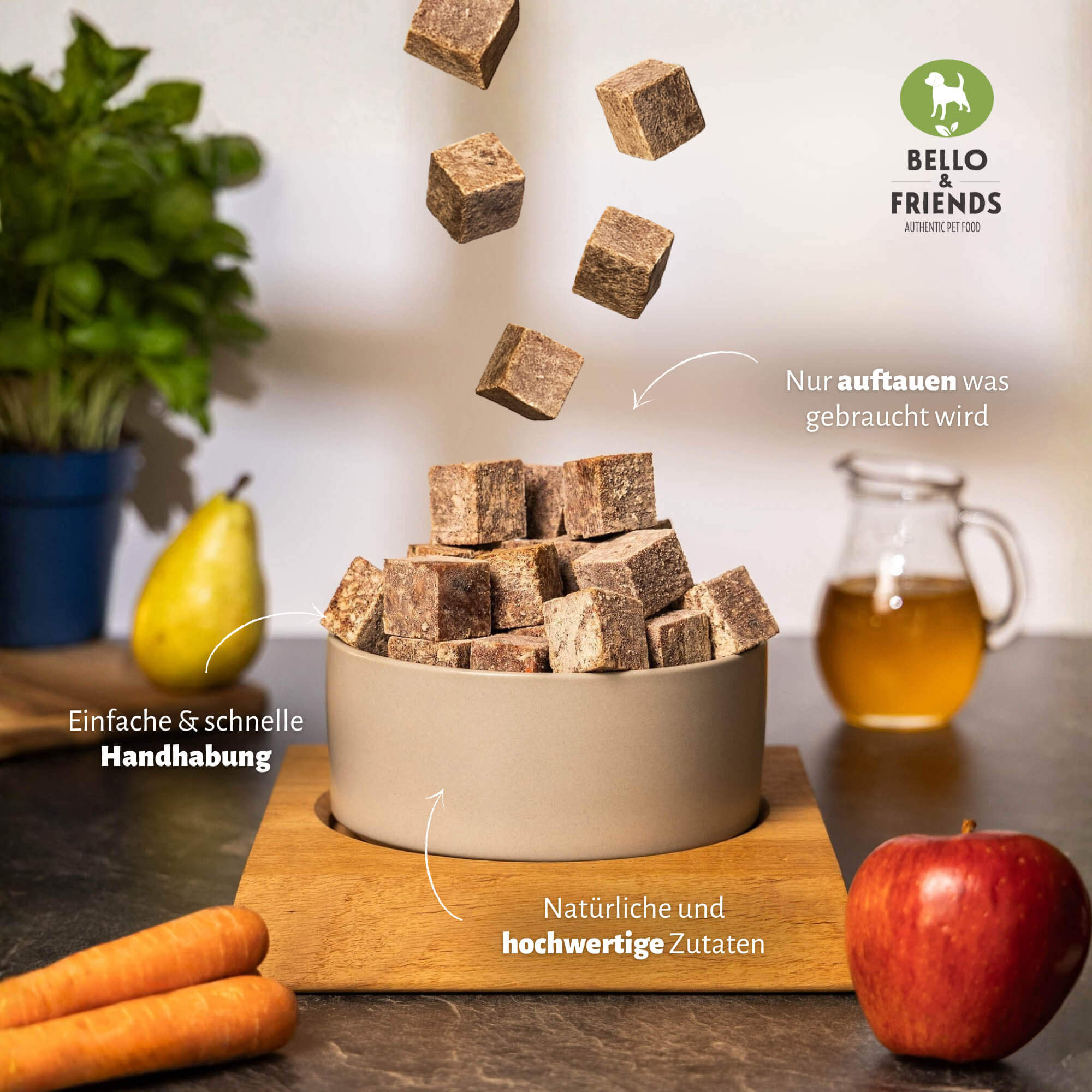 Die praktischen Complete Menü Würfel machen die Fütterung so einfach wie nie: Einfach portionieren, auftauen und servieren – und dein Hund kann sich auf eine schmackhafte und ausgewogene Mahlzeit freuen. Durch die feine Abstimmung mit Meersalz, Leinöl und aromatischen Kräutern der Provence wird das Menü nicht nur besonders schmackhaft, sondern unterstützt auch aktiv die Verdauung und das Immunsystem.