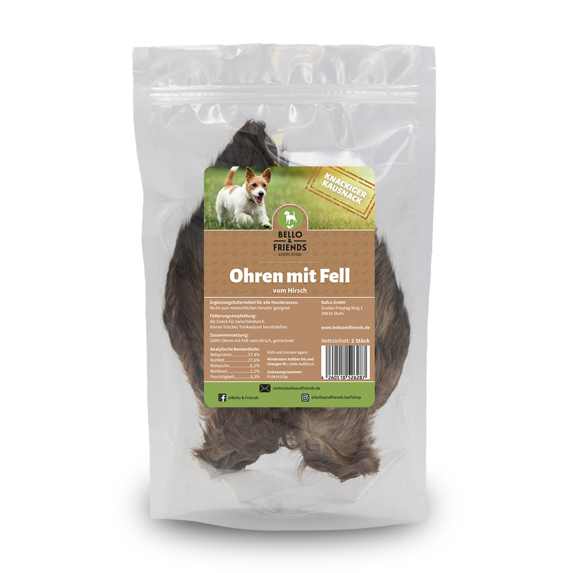 Verwöhne deinen Hund mit unseren getrockneten Hirschohren mit Fell, einem schmackhaften und gesunden Snack, der bei kleinen und großen Fellnasen gleichermaßen beliebt ist. Die feste und knackige Konsistenz der Hirschohren sorgt für langanhaltenden Kauspaß und stärkt gleichzeitig die Kiefer- und Nackenmuskulatur deines Hundes. Beim Zerkauen wird zudem Zahnstein auf natürliche Weise abgetragen, was zur Zahngesundheit deines Vierbeiners beiträgt. Unsere getrockneten Hirschohren sind eine ausgezeichnete Wahl für Hunde, die eine natürliche und artgerechte Belohnung genießen möchten. Diese hochwertigen Kauartikel bieten deinem Hund nicht nur eine leckere Abwechslung, sondern auch einen wertvollen Beitrag zu seiner Gesundheit.