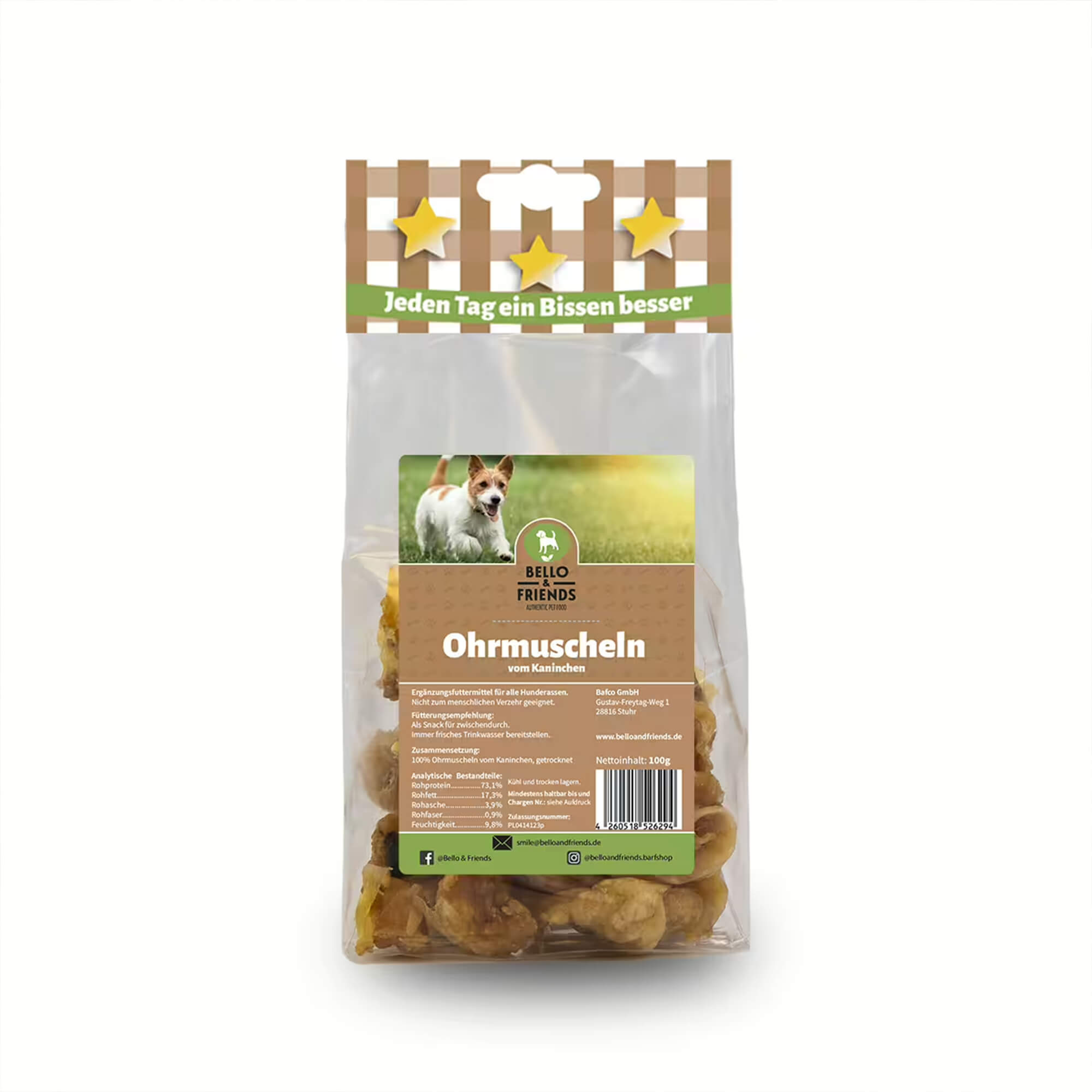 Verwöhne deinen Hund mit unseren getrockneten Kaninchenohrmuscheln, einem schmackhaften und gesunden Snack, der bei allen Hunden überaus beliebt ist. Diese Knabberohrmuscheln sind eine artgerechte und gesunde Alternative zu den oft stark behandelten Kausnacks aus dem Supermarkt.