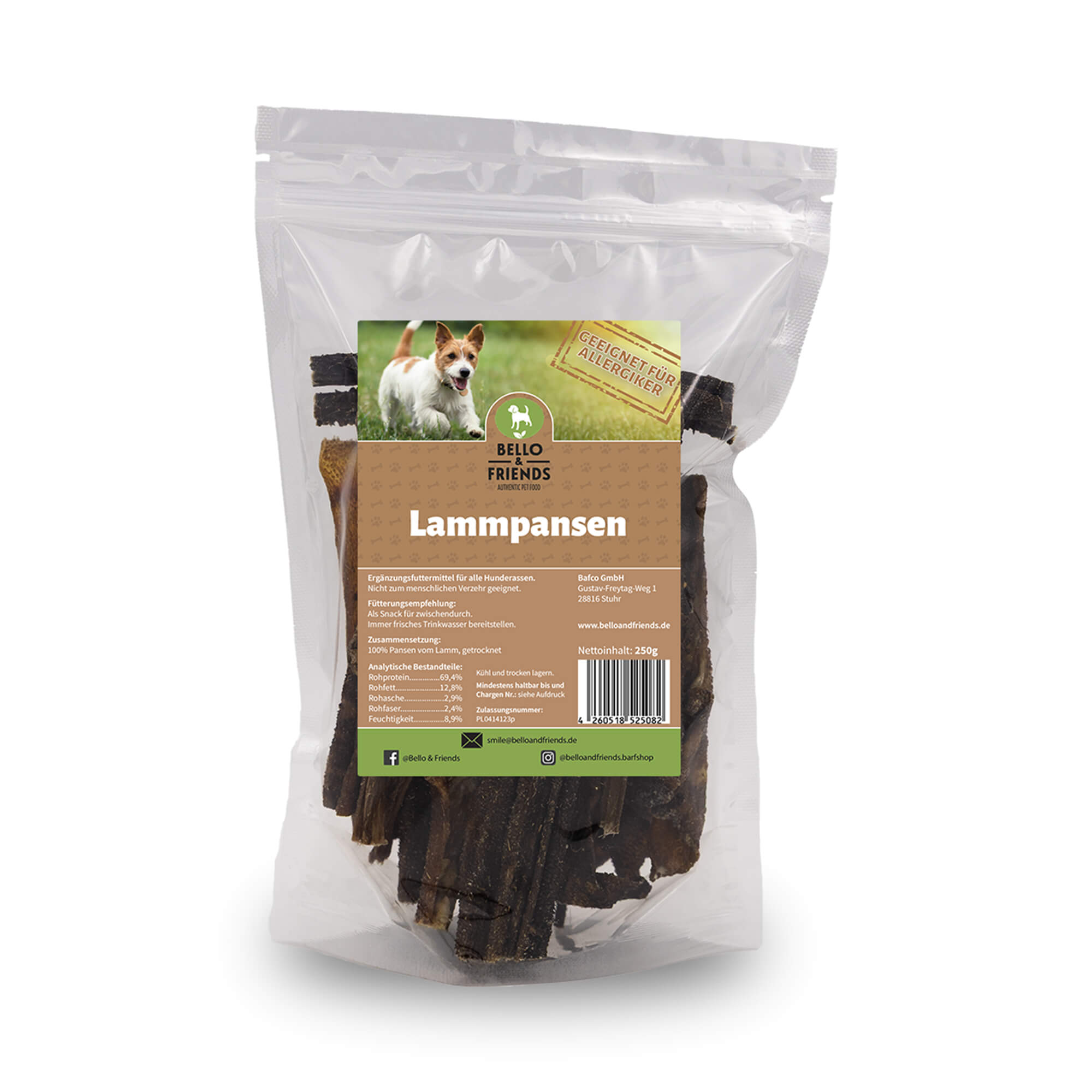 Unser Lammpansen getrocknet ist eine besondere Delikatesse. Ein leichtverdauliches Leckerchen, was auch Allergiker & Sensibelchenproblemlos vertragen. Lammpansen ist nicht nur für den Magen-Darm-Trakt Deines Hundes super, er schmeckt auch noch hervorragend. Stell Dich auf feuchte Näschen und tropfende Schnäuzchen ein, wenn Du Deinem Liebling unseren Lammpansen in Aussicht stellst.