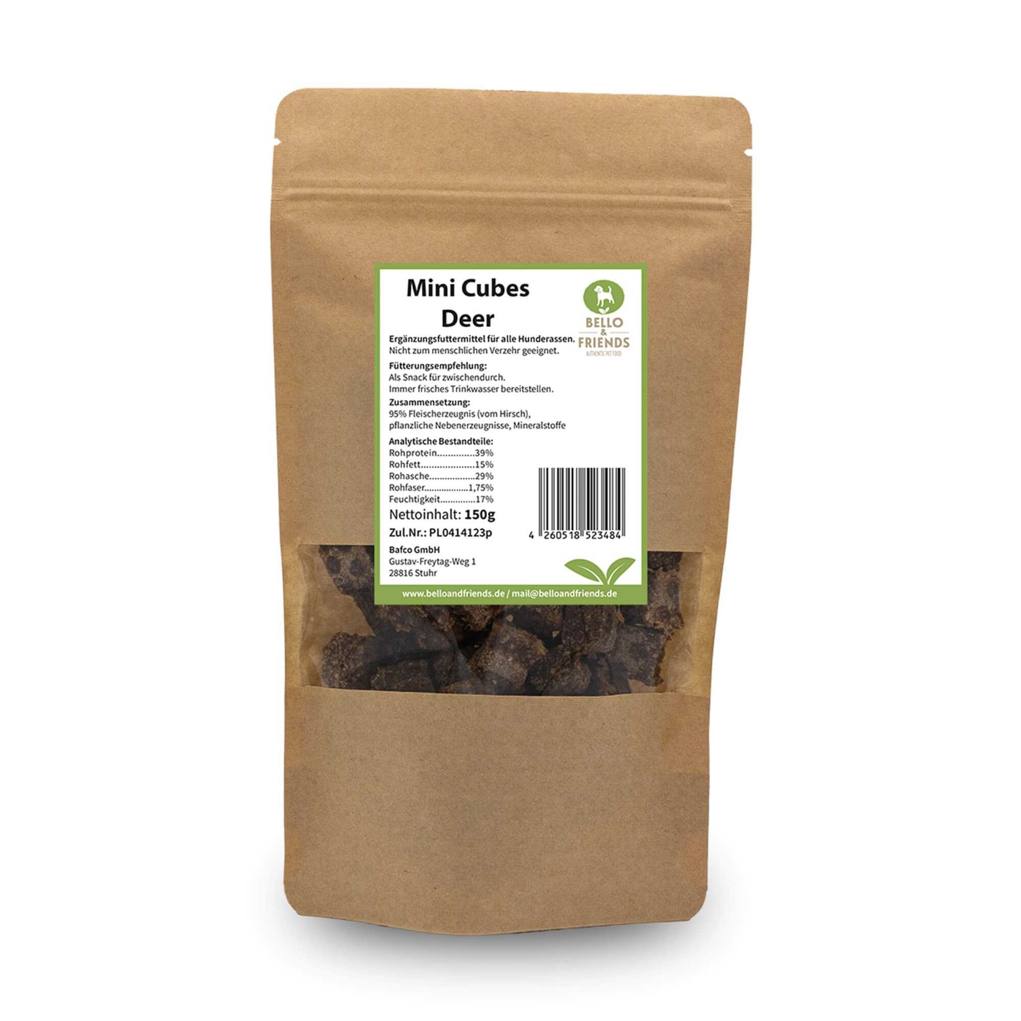 So groß wie ein kleiner Würfel und mit 6 Seiten voller fleischigem Genuss. Unsere Mini Cubes DEER dürfen in keiner Jackentasche fehlen und werden dir die Aufmerksamkeit Deines Lieblings sichern.