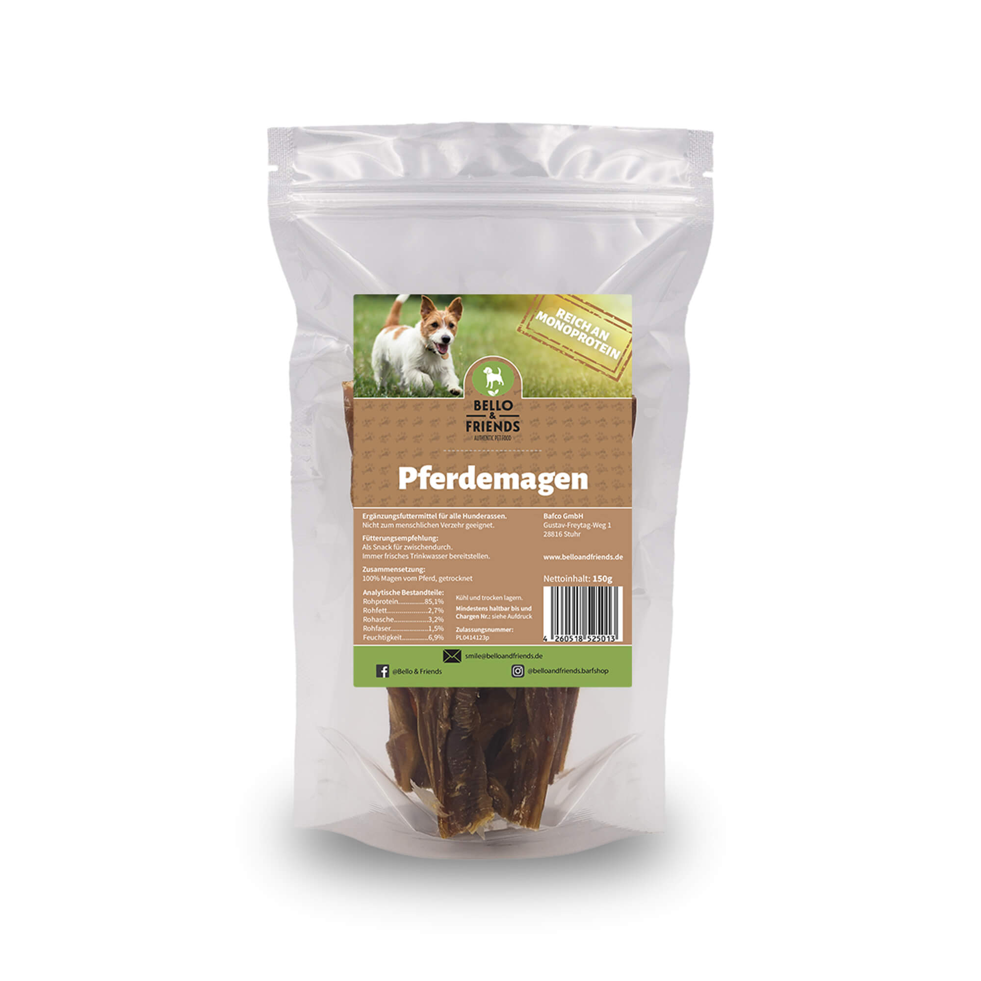 Ohne Zusätze, ohne Zucker und ohne Chemikalien wird der Pferdemagen in unserer hauseigenen Trockenanlage gedörrt. Die meisten Hunde, die unter Allergien leiden vertragen gerade Pferdefleisch ausgezeichnet und müssen somit auf keinen Genuss und keine Fleischfreuden verzichten.