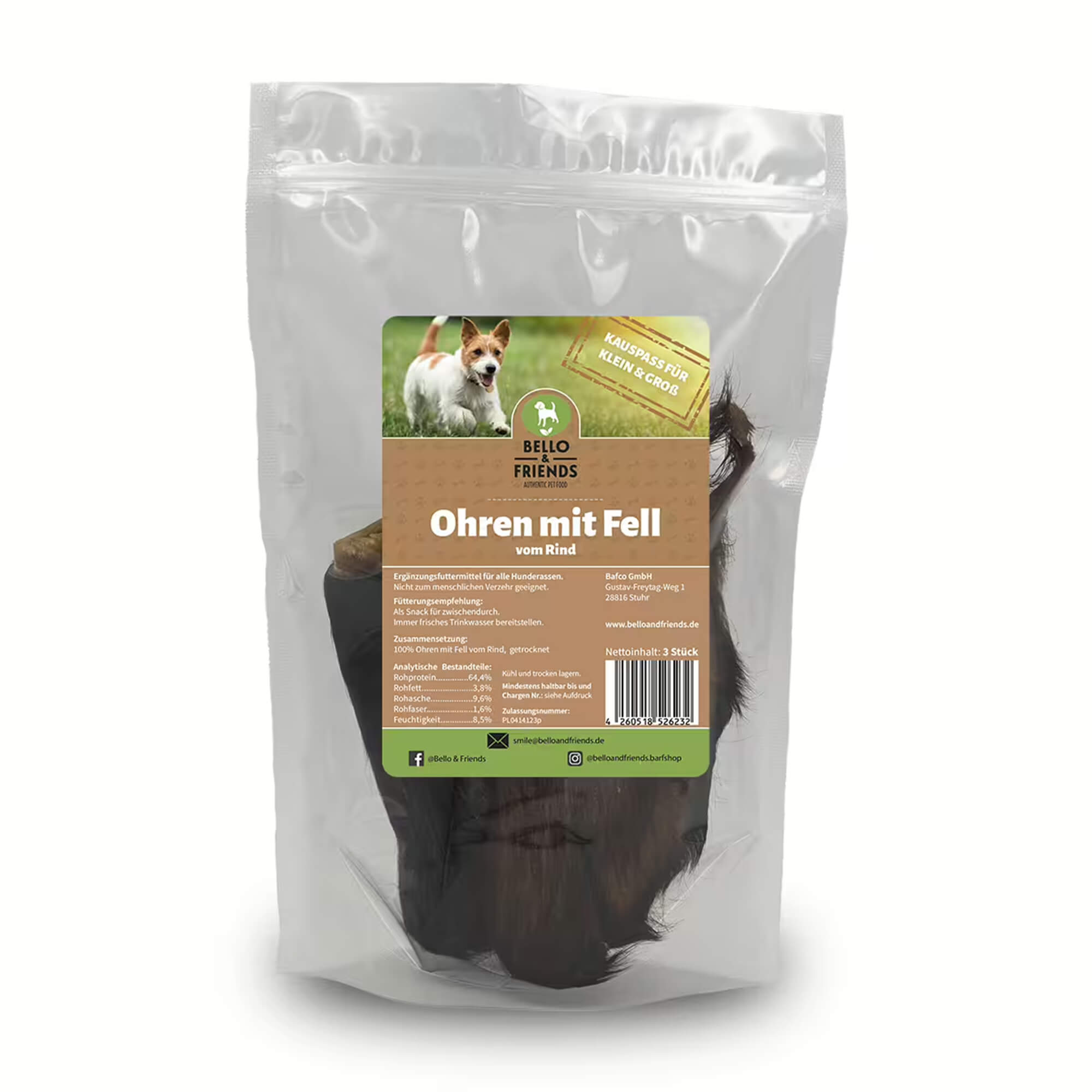Rinderohren mit Fell entsprechen zudem dem natürlichen Fressverhalten des Hundes.