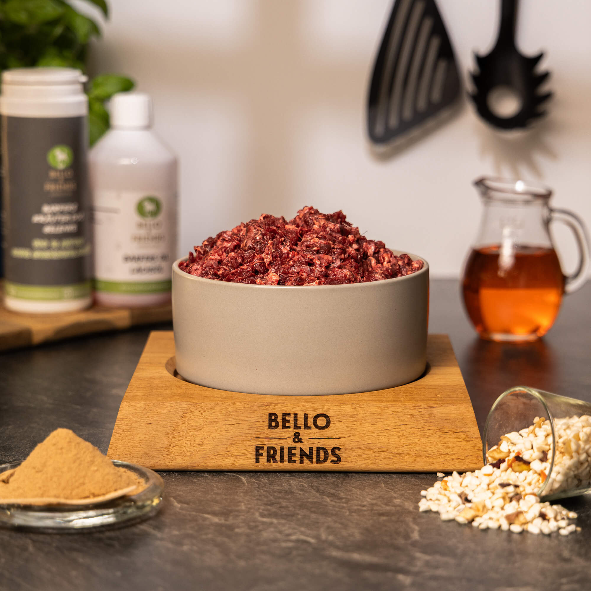 Bitte beachte, dass dieses Produkt allein keine vollwertige und ausgewogenen Mahlzeit für Deinen Hund darstellt, sondern nur ein Einzelfuttermittel ist. Im Rahmen eines BARF-Plan müssen noch pflanzlichen Anteile, Öle und Zusätze beigefügt werden. Falls Du dazu Fragen hast, sprich uns an, oder vertrau auf die Qualität unserer BARF Complete Menus, wo wir für Dich die optimale Komposition bereits zusammengestellt haben.