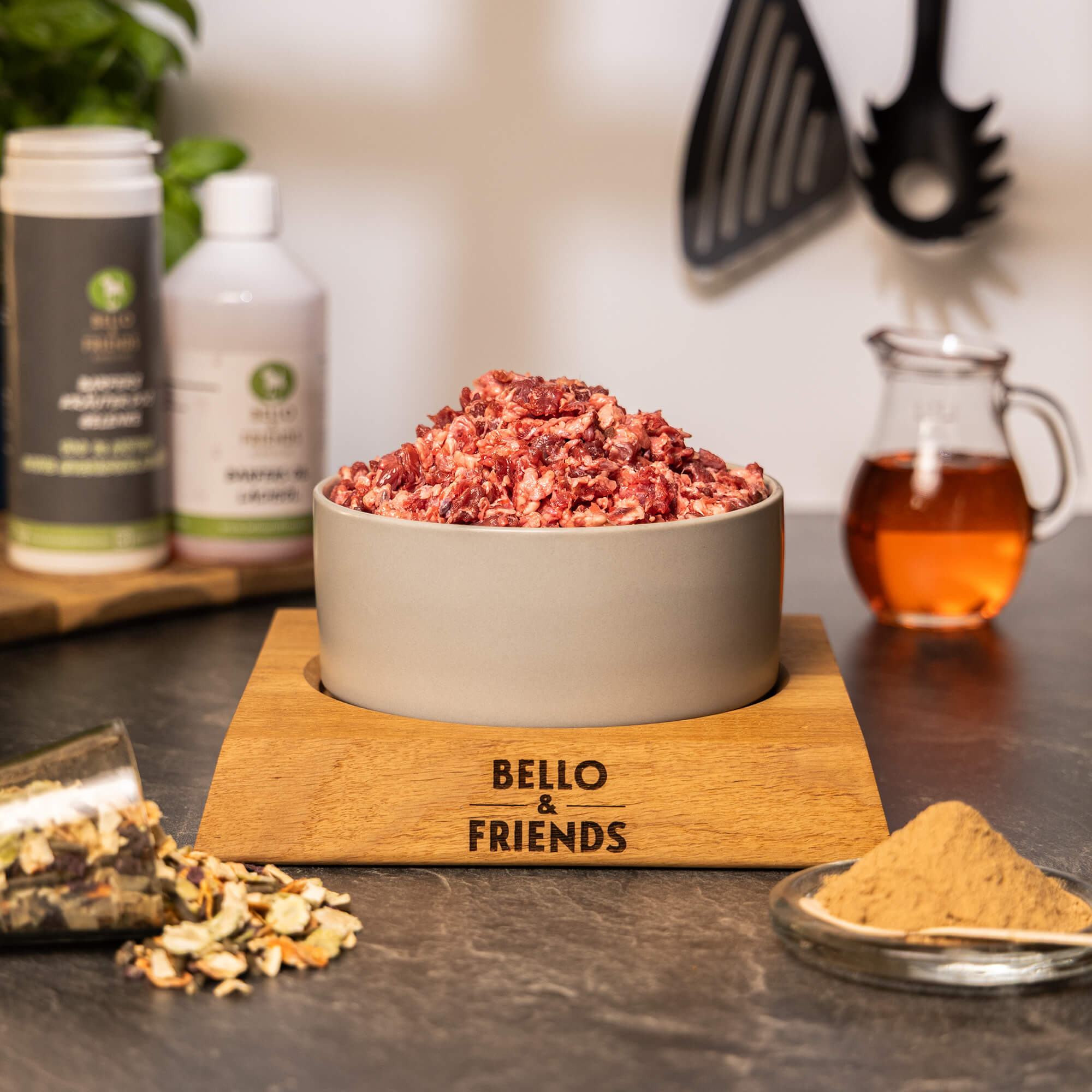 Bitte beachte, dass dieses Produkt allein keine vollwertige und ausgewogenen Mahlzeit für Deinen Hund darstellt, sondern nur ein Einzelfuttermittel ist. Im Rahmen eines BARF-Plan müssen noch pflanzlichen Anteile, Öle und Zusätze beigefügt werden. Falls Du dazu Fragen hast, sprich uns an, oder vertrau auf die Qualität unserer BARF Complete Menus, wo wir für Dich die optimale Komposition bereits zusammengestellt haben.