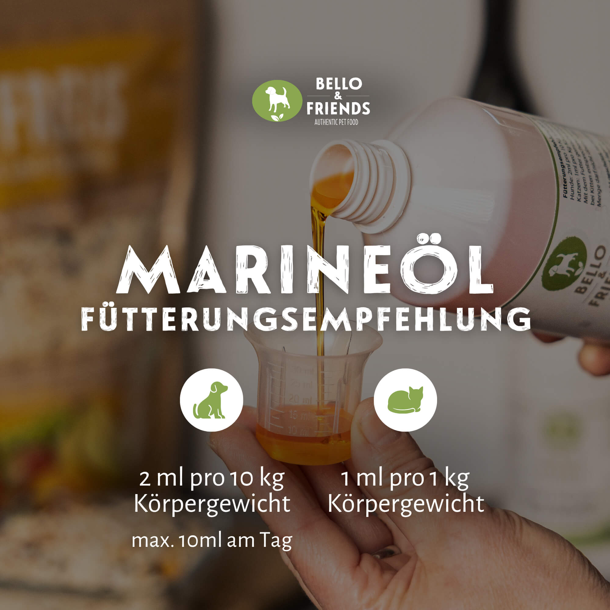 Hochwertige Marine Omega-3-Öle liefern essenzielle Fettsäuren und sind eine wertvolle Ergänzung für die tägliche Fütterung von Hunden und Katzen. Die ausgewogene Kombination aus Fischölen und pflanzlichen Ölen unterstützt eine bedarfsgerechte Versorgung mit Omega-3- und Omega-6-Fettsäuren und eignet sich ideal für BARF- sowie Nass- oder Trockenfutterrationen.