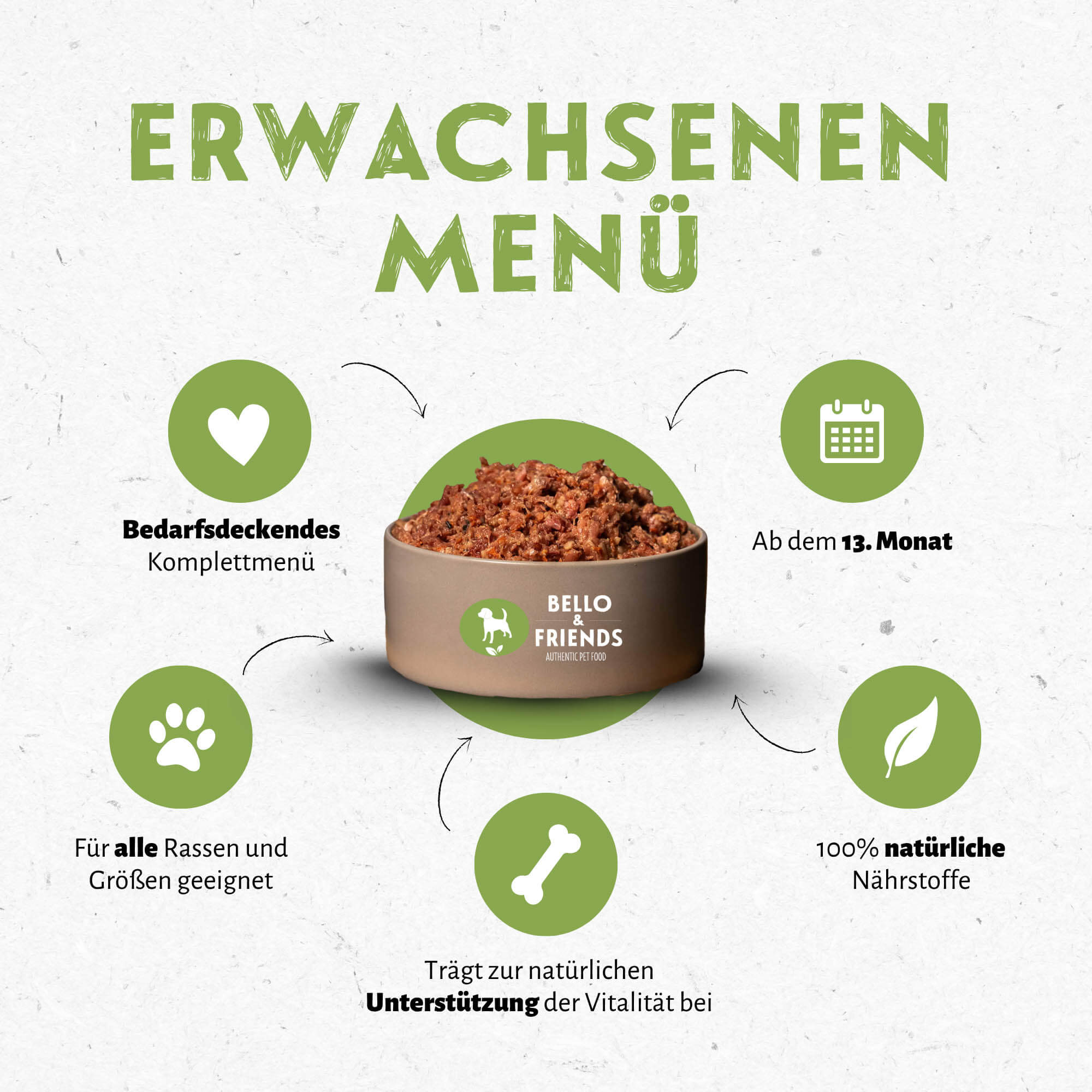 Fütterungsempfehlung: Dein Vierbeiner freut sich über 2-4 % seines Körpergewichtes des Menü als Tagesration. Wir empfehlen die Tagesration in 2-3 Portionen am Tag aufzuteilen und immer frisches Wasser bereitzustellen.