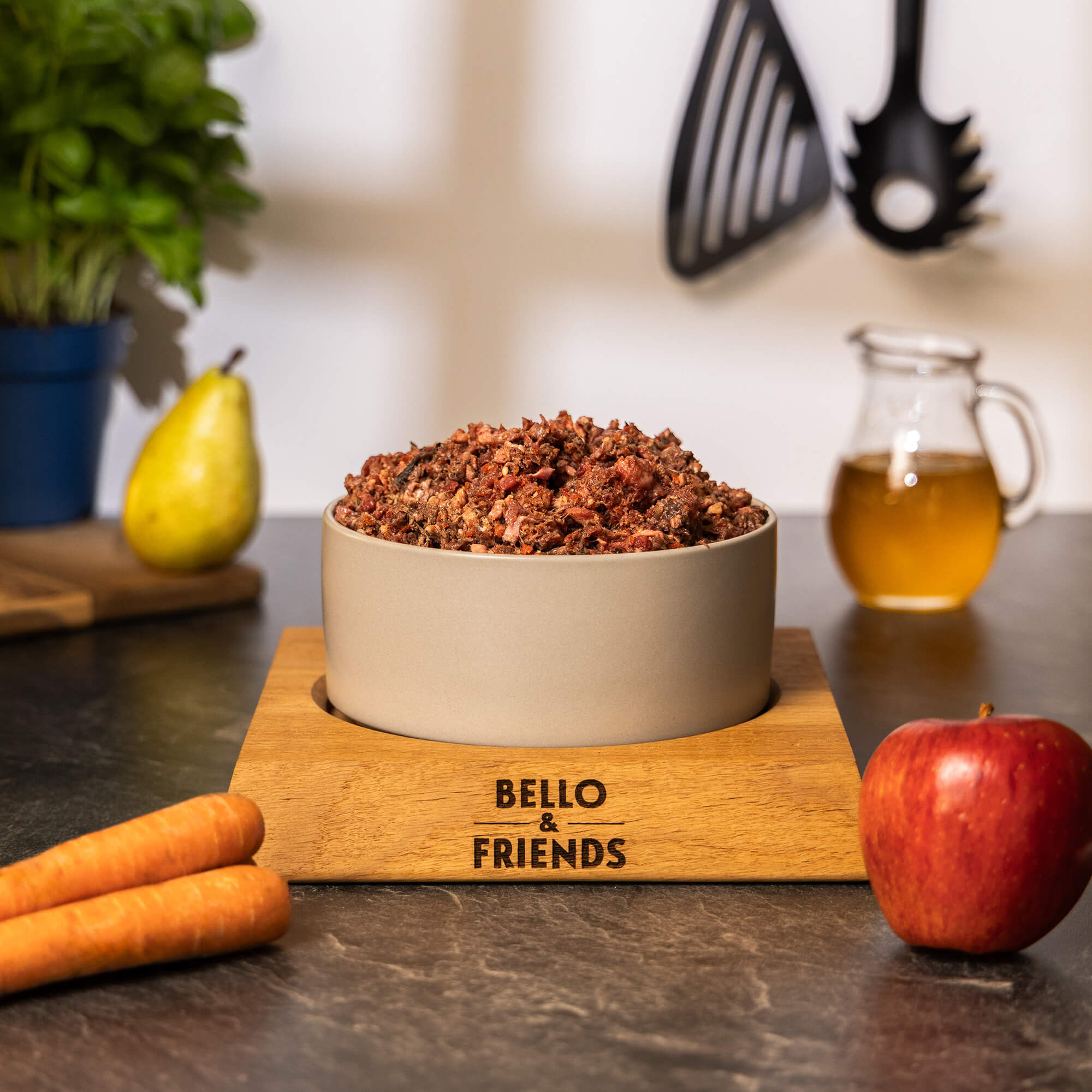 Apfel, Birne und Karotten ergänzen dieses proteinreiche Menü mit natürlichen Vitaminen und Mineralien, die das Immunsystem stärken und zur gesunden Haut und glänzendem Fell beitragen. Bierhefe und Leinöl, reich an B-Vitaminen und Omega-Fettsäuren, fördern zusätzlich die Verdauung und Hautgesundheit. Abgerundet wird dieses ernährungsphysiologisch vollständige Menü durch eine feine Auswahl an Kräutern der Provence, die nicht nur den Geschmack bereichern, sondern auch antioxidative Eigenschaften haben.