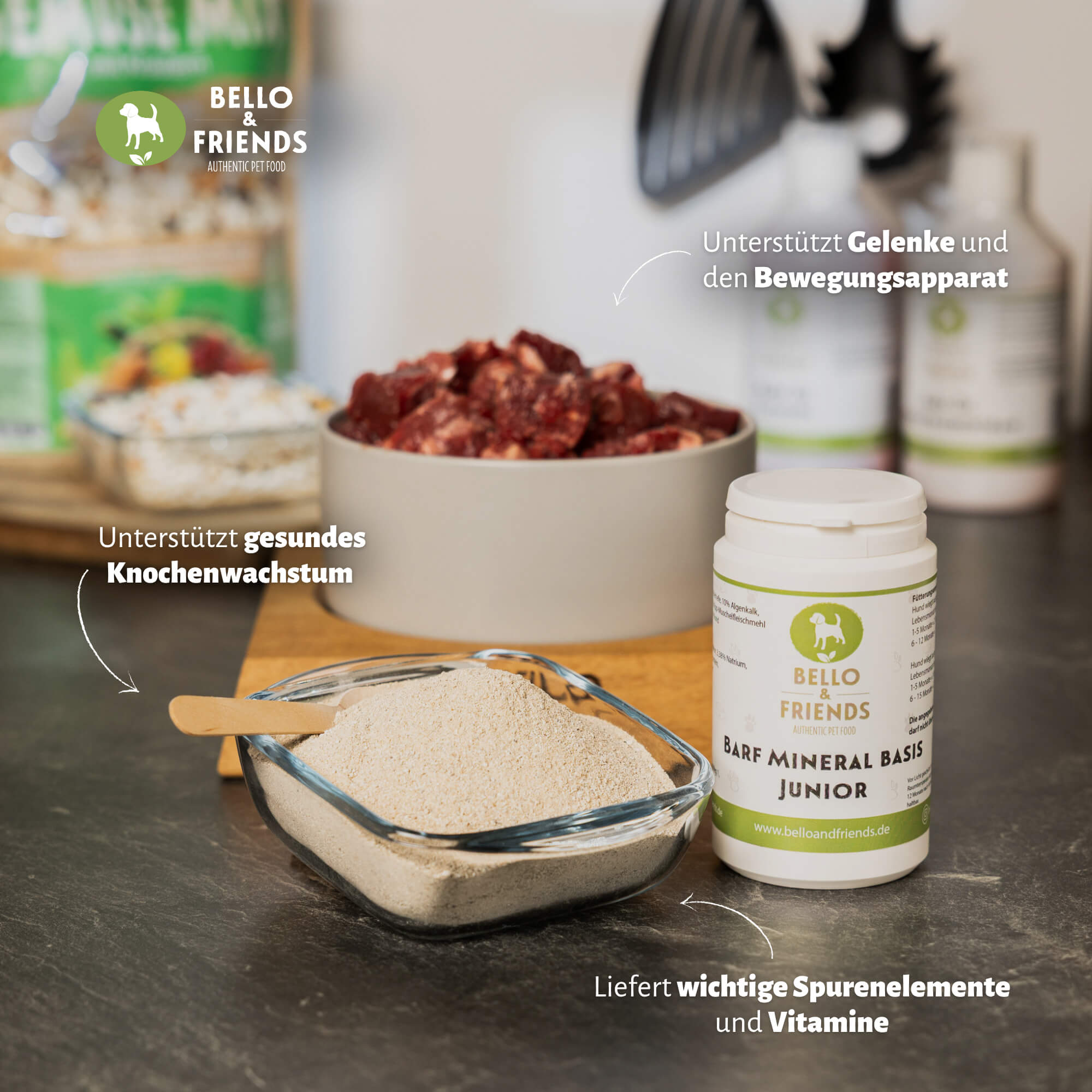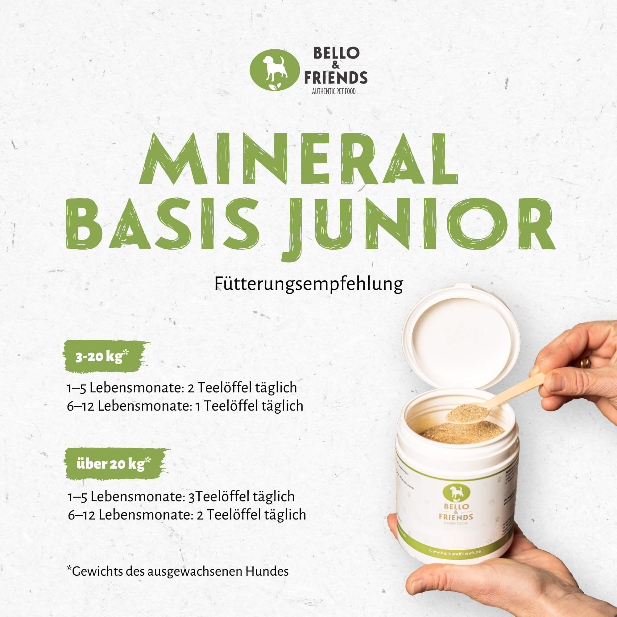 Gerade im Wachstum ist ein ausgewogenes Verhältnis von Mineralstoffen besonders wichtig. Das feine Pulver lässt sich einfach unter das tägliche Futter mischen und eignet sich ideal für die BARF-Fütterung von Welpen und Junghunden.