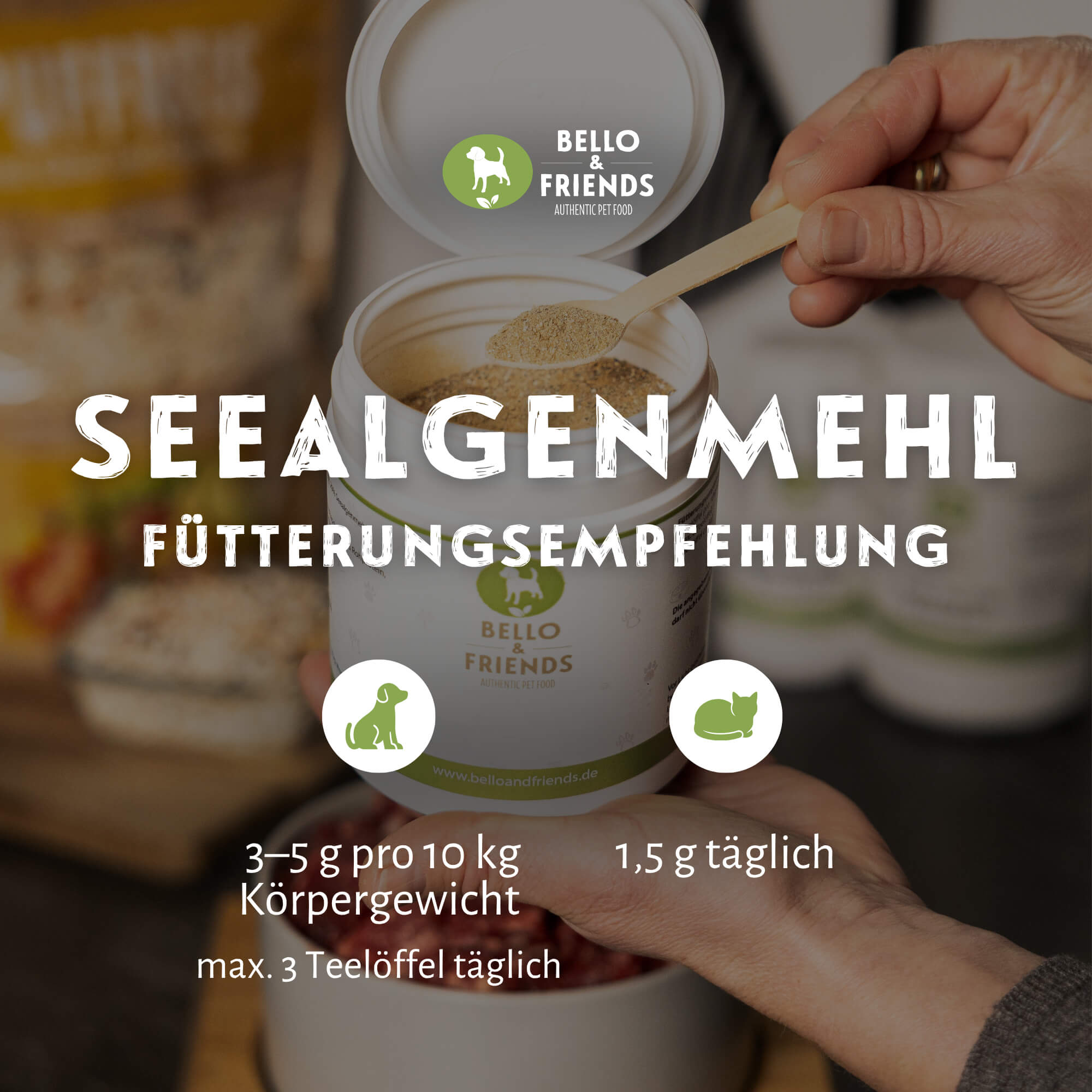 Das feine Pulver lässt sich einfach unter das tägliche Futter mischen und eignet sich sowohl für BARF- als auch für Nass- oder Trockenfutter. Aufgrund des natürlichen Jodgehalts sollte die Dosierung sorgfältig eingehalten werden.
