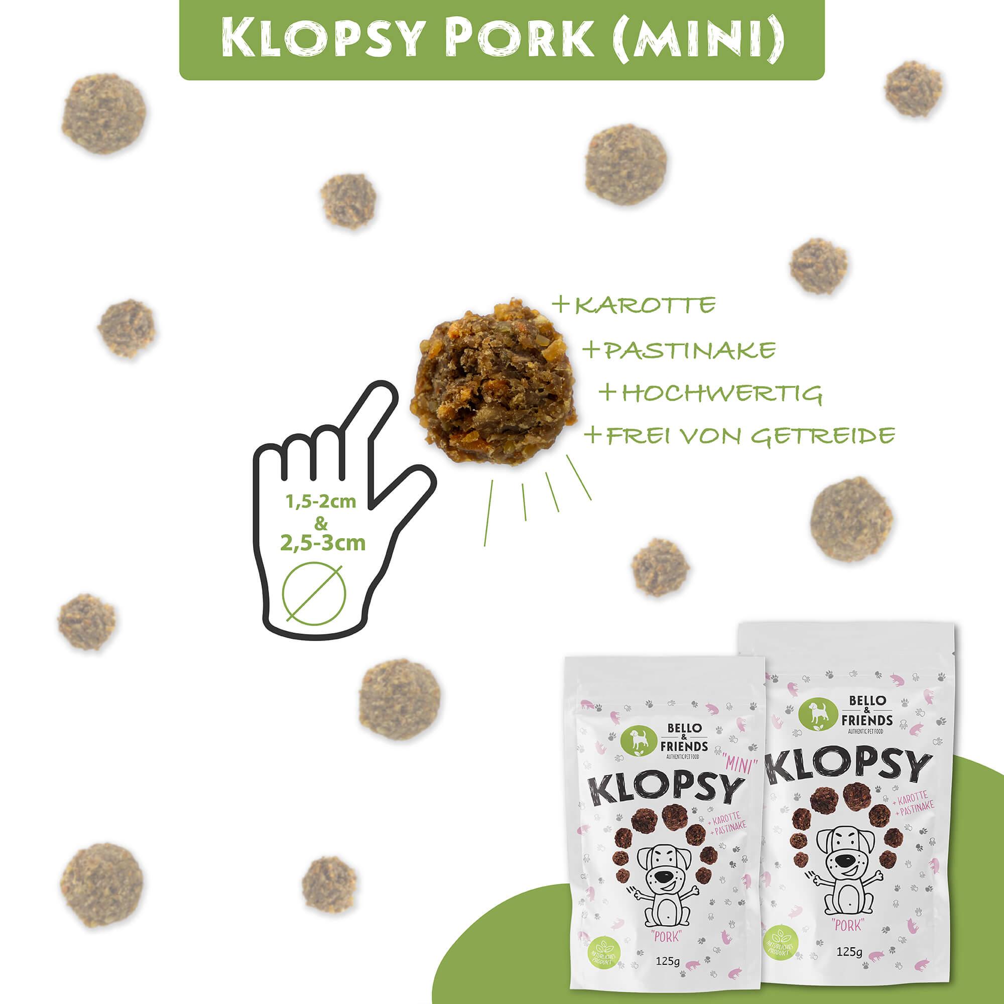 Unsere Klopsy Schwein sind in zwei praktischen Größen erhältlich: Normal und Mini. Die normalen Klopsy sind ideal für mittelgroße bis große Hunde, während die Mini-Klopsy perfekt für kleine Hunde oder als Trainingsleckerli geeignet sind. So findet jeder Hund die passende Größe und kann den vollen Genuss der leckeren Fleischbällchen erleben.