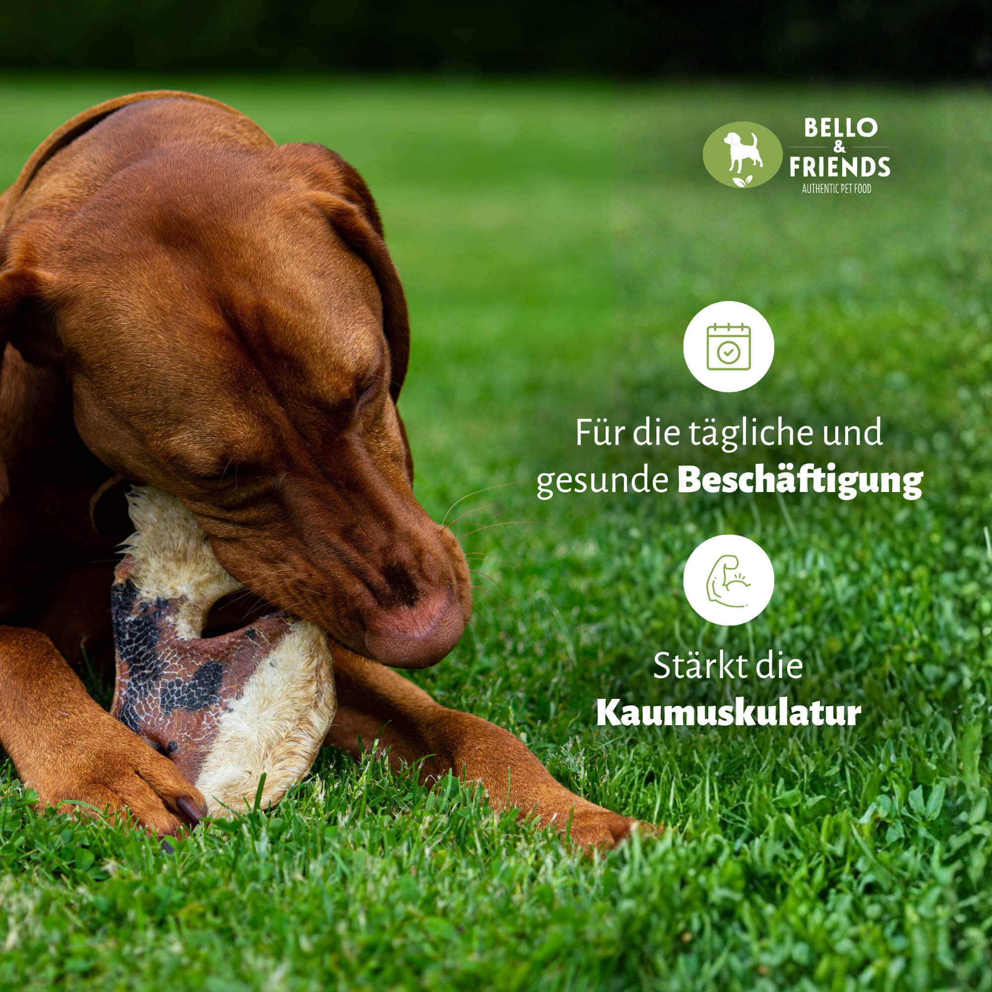 Durch die harte Struktur der getrockneten Sehne muss Dein Liebling sich richtig anstrengen, um etwas von seinem leckeren Snack ab zu bekommen. Erst wenn das Gewebe aufgeweicht ist, kann er Stückchen für Stückchen davon genießen.