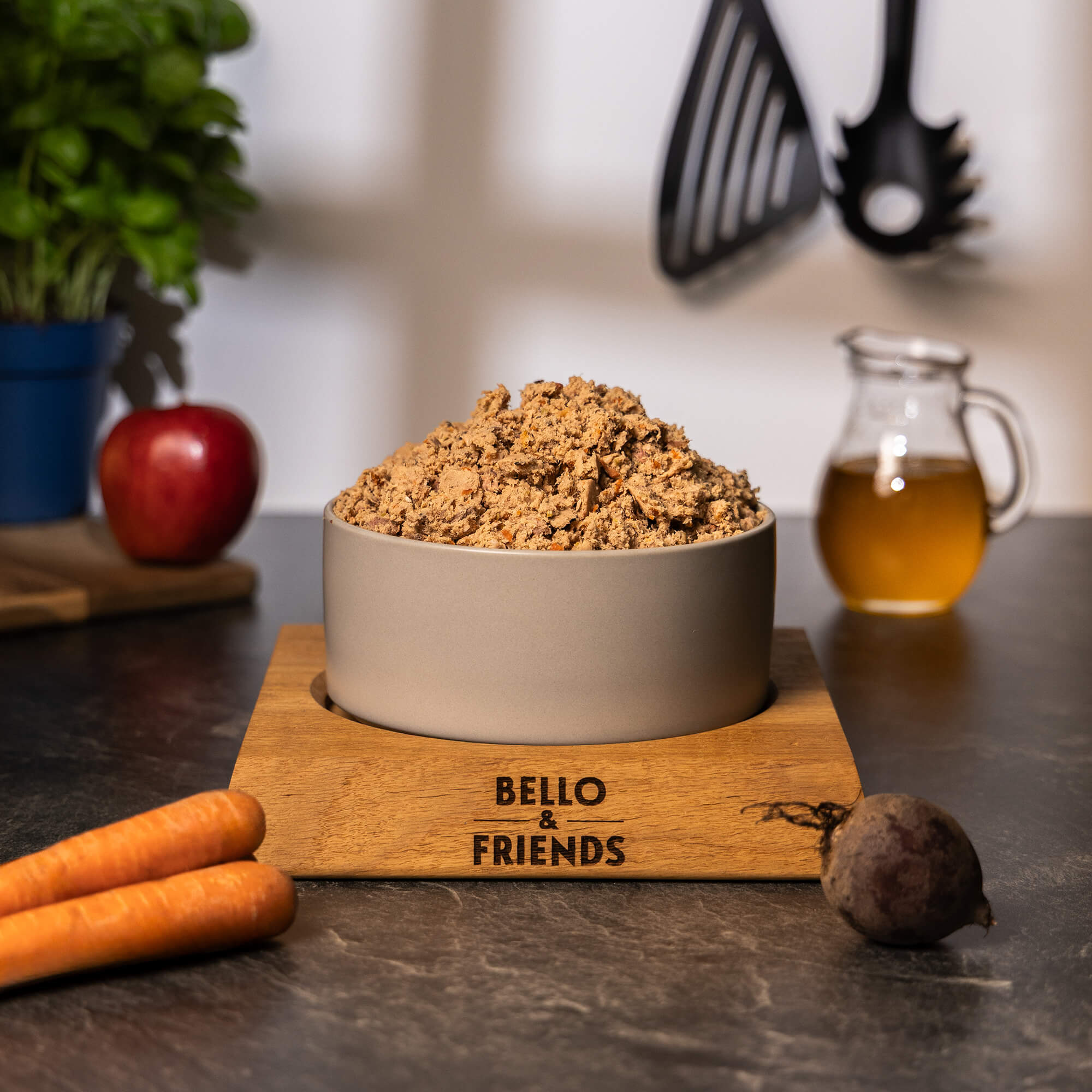 Abgerundet wird die Komposition mit unserem bewährten Bello’s Vitalmix, Eierschalenpulver zur Calciumversorgung, Leinöl für glänzendes Fell und gesunde Haut, sowie einer Prise Meersalz und den duftenden Kräutern der Provence. Eine harmonisch abgestimmte Mahlzeit, die alle ernährungsphysiologischen Bedürfnisse Deines Lieblings erfüllt.