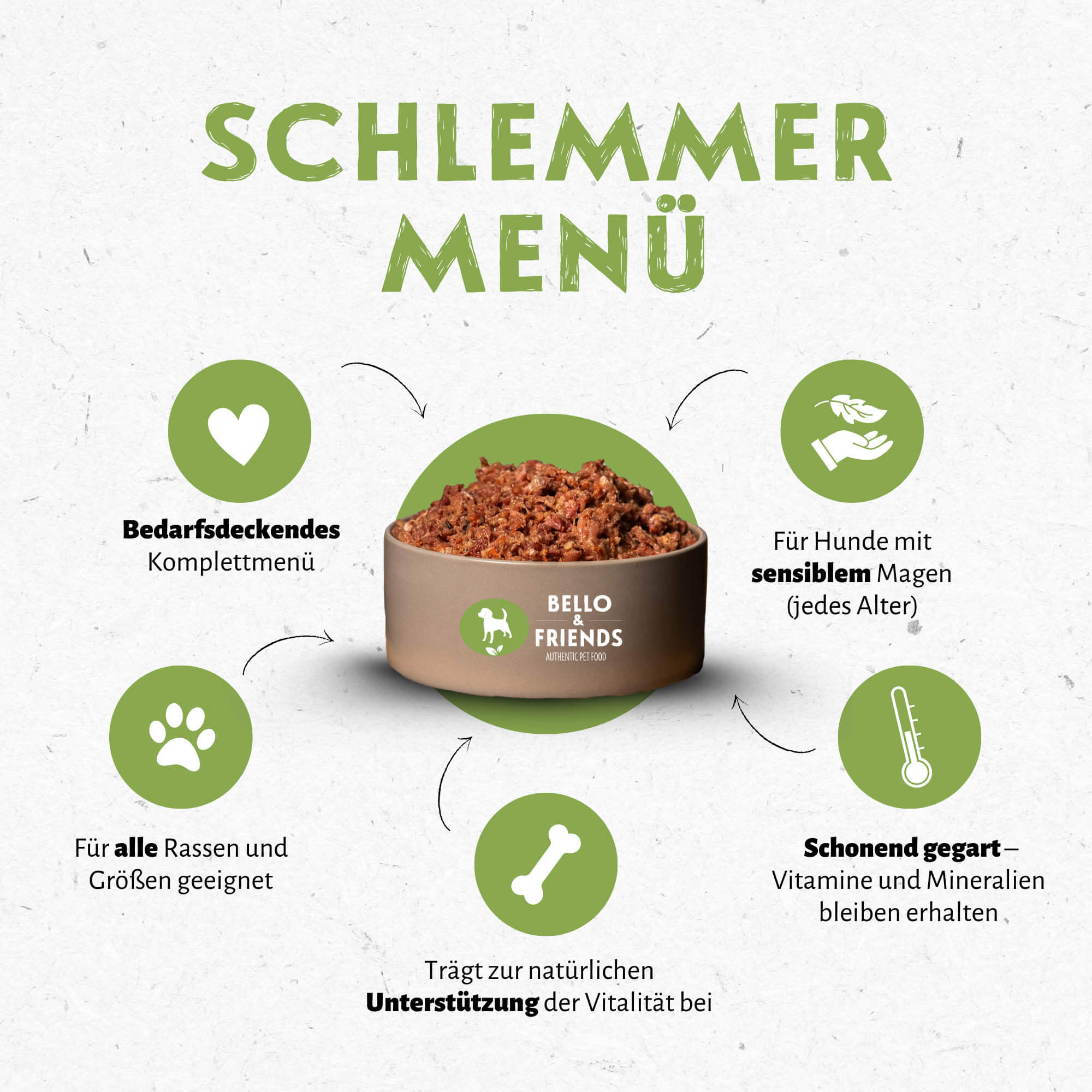 Gegart statt Roh - Unser Schlemmer Menü ist die ideale Lösung für alle, die das Beste aus traditioneller BARF-Ernährung lieben, aber auf den rohen Anteil verzichten möchten. Schonend gegart, bleibt es nicht nur besonders nährstoffreich, sondern ist auch optimal verträglich – selbst für empfindliche Hunde. Der sanfte Garprozess bewahrt Vitamine, Enzyme und Mineralstoffe und macht das Menü gleichzeitig besonders aromatisch. Es duftet nicht nur köstlich, sondern überzeugt auch durch seine inneren Werte.